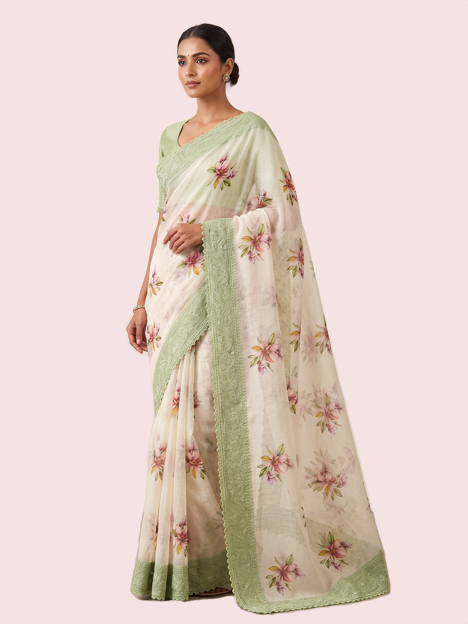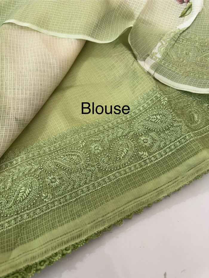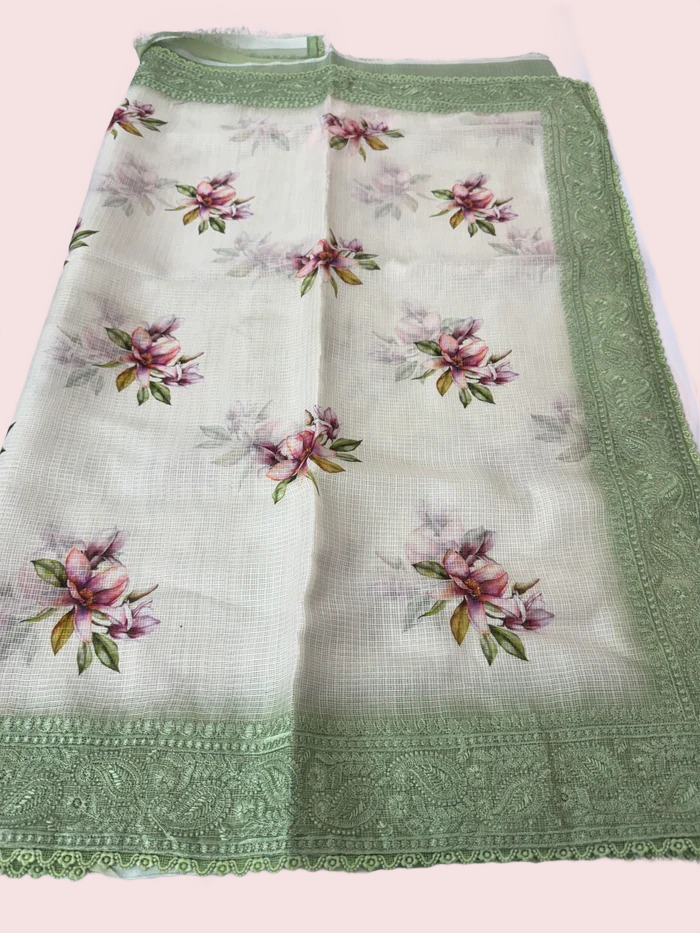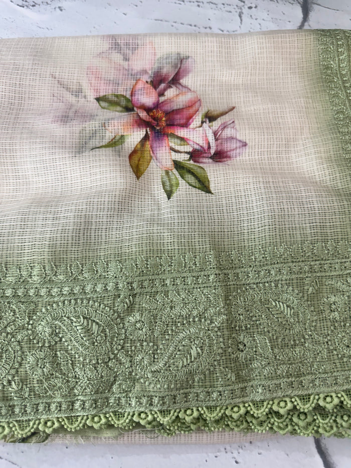 Embroided Kota Silk Saree with Green Chikankari Border