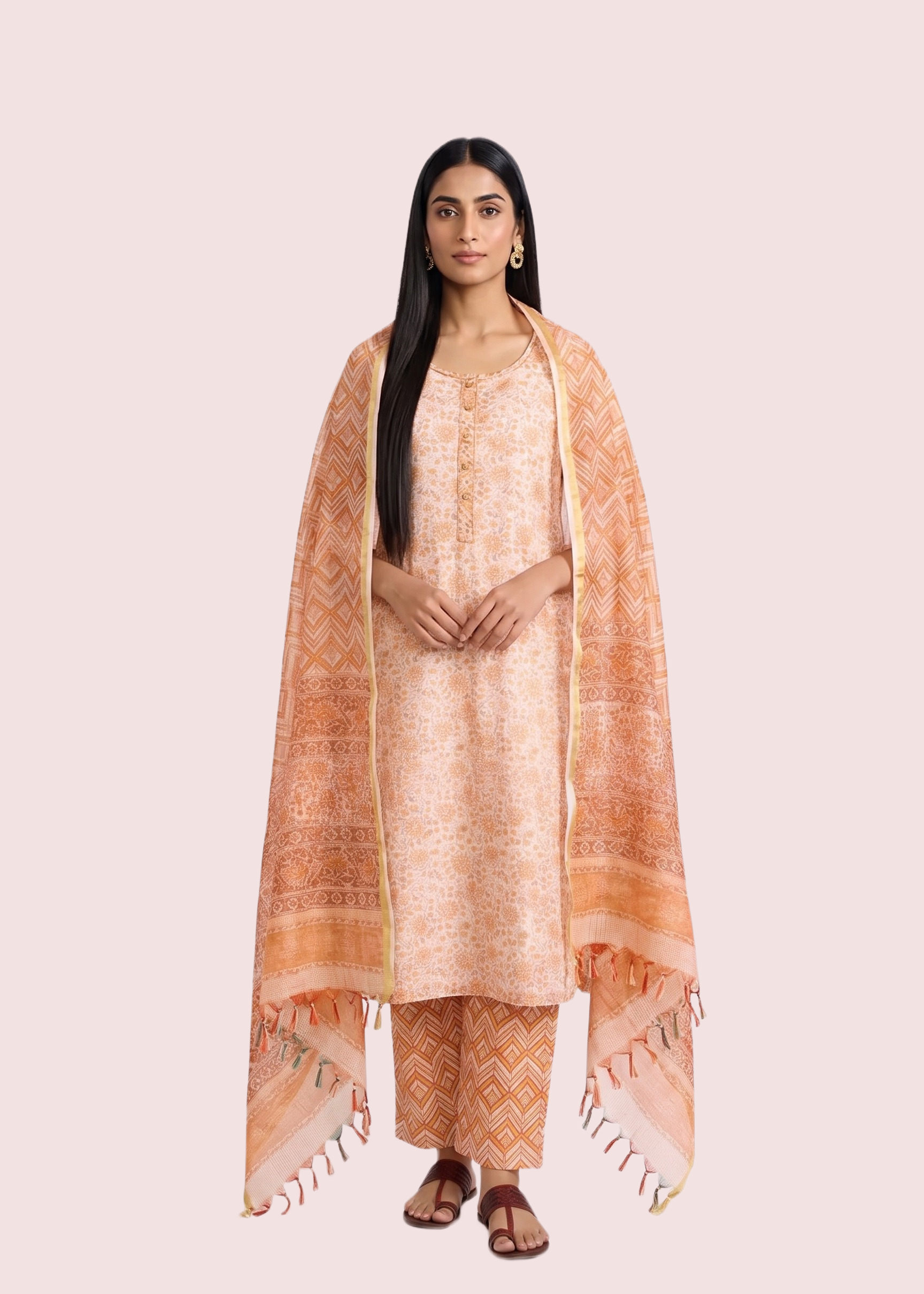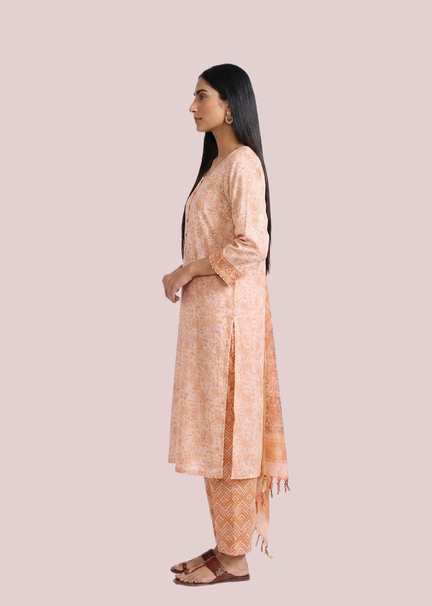 Crafted from lightweight fabric, the suit-set features delicate floral patterns that create a soft, feminine look. It is paired with comfortable printed cotton pants and a sheer Kota Doria dupatta finished with subtle borders.